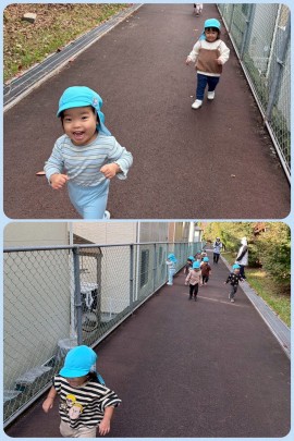保育風景 11月 子どもの姿 2025年11月30日(日) 寒さに負けず! 0才児ひよこ組 この日は、お部屋の中で体操ごっこ。 鉄棒を出して遊びました。 ぶら下がってこの笑顔。 未来の体操選手 楽しみです。 同じく 0才児。 太陽が出て ぽかぽかの日はお散歩に。 何か発見! お外はやっぱり気持ちいい~ 1歳児 りす組 遊歩道を自由に走る子どもたち。 走ることが大好きなりす組さんにとっては、 最高の場所です。 体力づくり頑張っています。 もどる