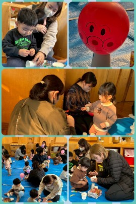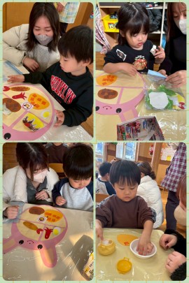 保育風景 2月のこどもの姿 2026年2月28日(土) 参観日がありました 未満児編 0歳児は 親子で体を動かしたり、 一緒にでんでんだいこをつくりました。 おうちの方が来ていても、いつもと変わらず 過ごしていた0歳児さんです。 1歳児さんも親子ダンスを楽しんだり、 日頃の様子の動画を見て楽しみました。 いつもの園の姿を見て、おうちの方も 始終にこにこでした。 2歳児さん。 手作りお子様ランチプレートに挑戦。 保育で頑張っている、はさみやのりを使って 楽しくプレートづくり。 おうちの方も子どもたちの成長を ひしひしと感じたようです。 もどる