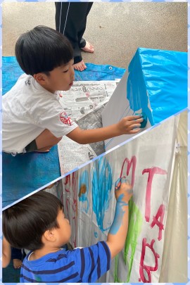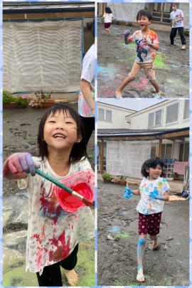 保育風景 9月の子どもの姿 2025年9月30日(火) ボディペインティングをしました たくさんtシャツに絵の具を付けて、 思いっきり遊びました。 いろいろな色が混ざって、世界で一つだけの素敵な tシャツが出来ました。 顔にも、身体にも 絵の具をべたべた 「先生にもつけちゃうぞ~」って満面の笑みです。 運動会で使用する、入場門にも 色塗りを。 素敵なのが出来上がりました。 ありがとう、ぞうぐみさん😝 もどる