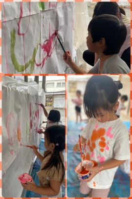 保育風景 9月の子どもの姿 2025年9月30日(火) ボディペインティングをしました 3歳児さんも 参加しました。 みんな 大きな紙に大胆に 絵を描いてくれました。 4歳児さんも、絵を描いたり、 自分のtシャツに描いたりと 思い思いに楽しんでいました。 もどる