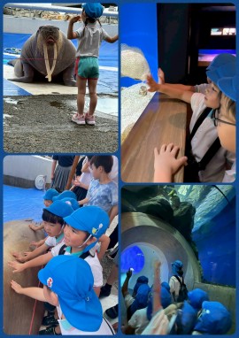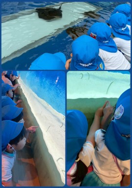 保育風景 9月の子どもの姿 2025年9月30日(火) うみたまごに行きました イルカのショーをみるぞうぐみさん。 イルカのパフォーマンスに大喜び。 水しぶきに気を付けて😣😏 エイにちんあなご、見るものすべてに、 大興奮😁😁 もどる