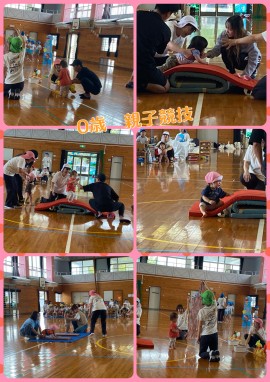 保育風景 10月の子どもの姿 2025年10月30日(木) 運動会がありました 0歳児のお部屋は、ハロウィン仕様。 子どもの足型で、かぼちゃをつくったり、 子どもの顔のこうもりが飛んでいたりと 可愛いお部屋になっています。 0歳児、運動会。 親子競技では、きのこを目指して、 やまこえ、たにこえ 頑張りました。 たくさんのきのこをゲットでき、 ニコニコの子ども達でした。 もどる