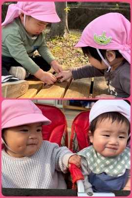 保育風景 11月 子どもの姿 2025年11月30日(日) 寒さに負けず! 0才児ひよこ組 この日は、お部屋の中で体操ごっこ。 鉄棒を出して遊びました。 ぶら下がってこの笑顔。 未来の体操選手 楽しみです。 同じく 0才児。 太陽が出て ぽかぽかの日はお散歩に。 何か発見! お外はやっぱり気持ちいい~ 1歳児 りす組 遊歩道を自由に走る子どもたち。 走ることが大好きなりす組さんにとっては、 最高の場所です。 体力づくり頑張っています。 もどる