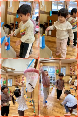 保育風景 11月の子ども姿 2025年11月30日(日) いろんなことに挑戦中 2歳児 うさぎ組 クリスマスに向けて、壁面づくり のりを使って、ステキなブーツを作りました。 真剣なこの表情。素敵ですね 同じく2歳児。 この日は、手づくりバスケットボール をしたり、ボール転がしをしたりと 保育士のアイディアいっぱいの手づくりおもちゃで 楽しく遊びました。 もどる